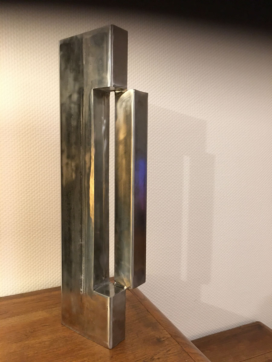 Sculpture acier contemporaine, de dimensions 60x15x5. Œuvre minimaliste inspirée du courant architecturale brutaliste.