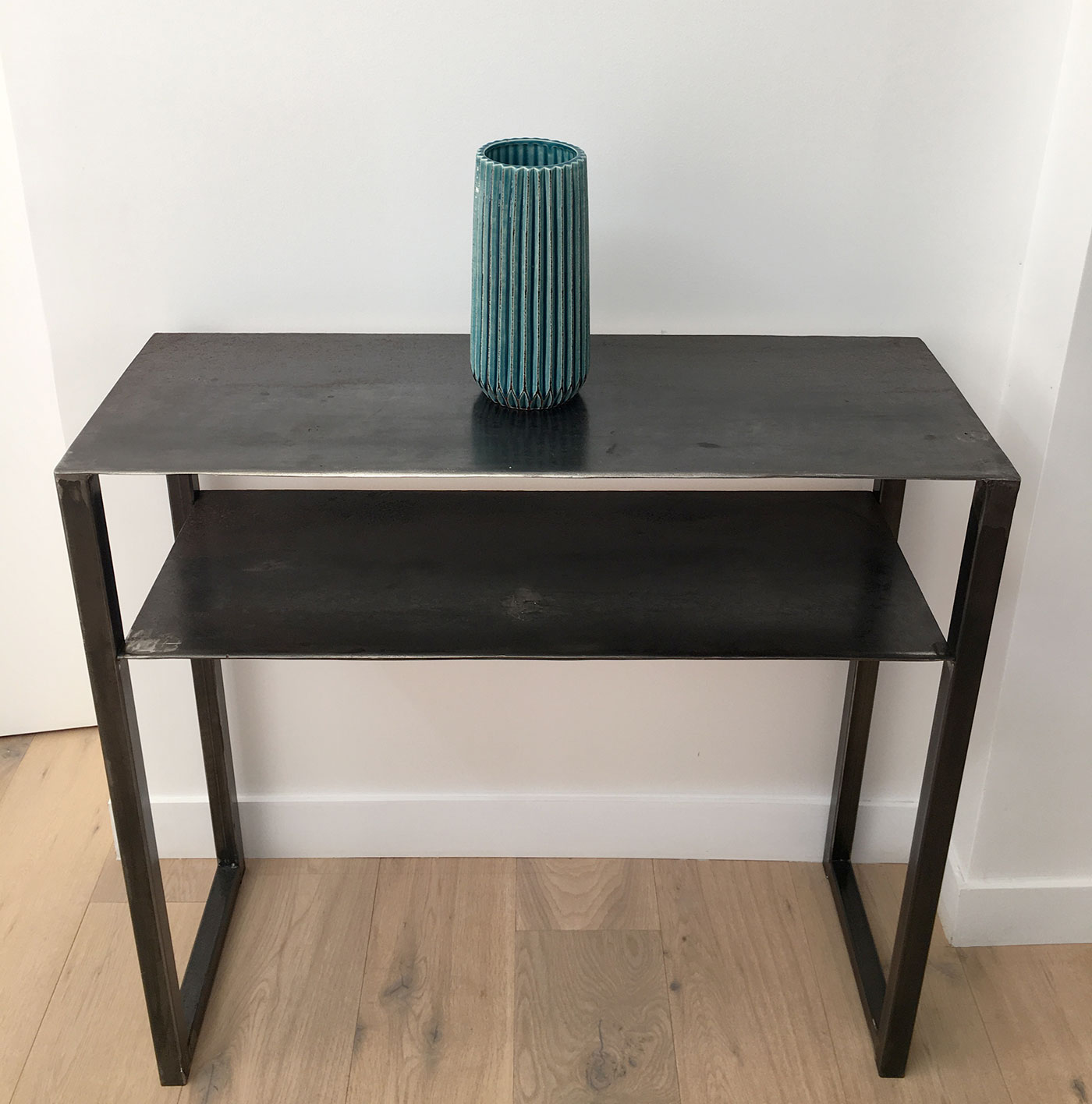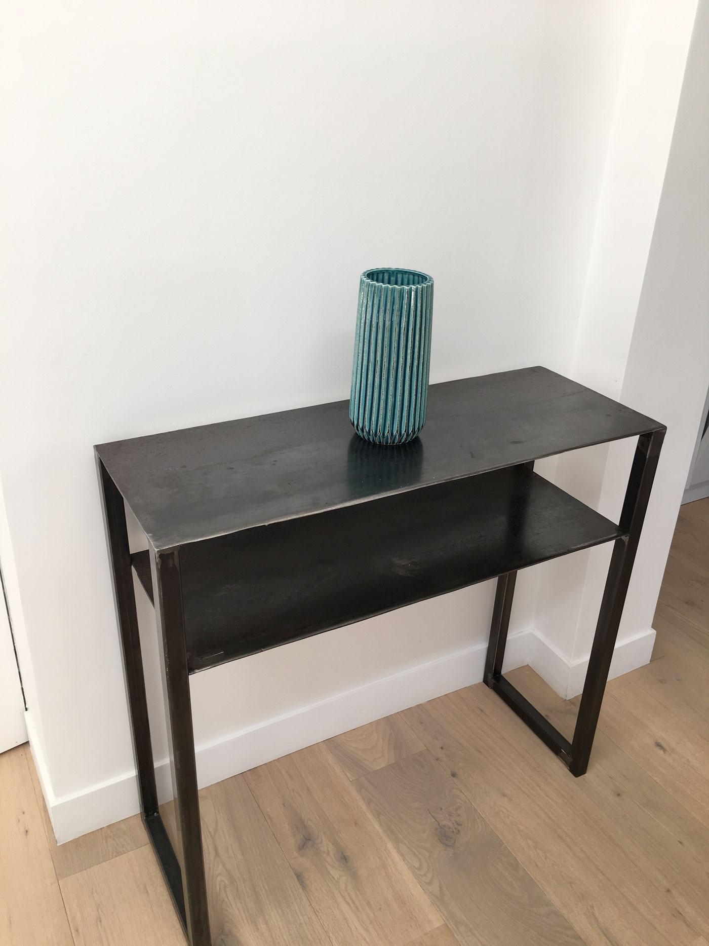 Console très design, au style industriel très marqué avec un look typé, conçue en Upcycling avec deux plateaux réalisés avec des plaques de récupération patinées. Les lignes très épurées lui confèrent un aspect très aérien. L’architecture minimaliste de cette console, rappelle le style brutaliste des années 50 à 70.