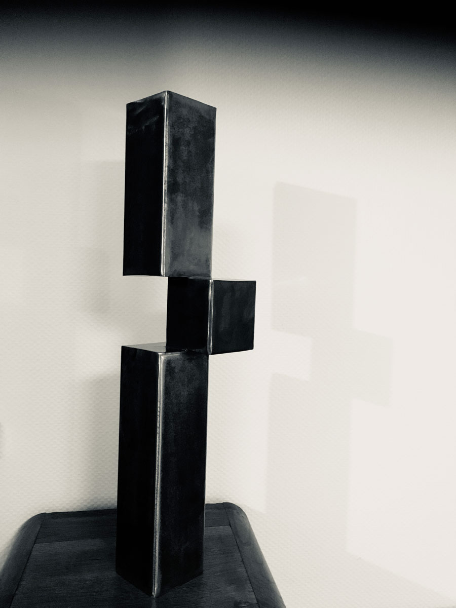 Sculpture acier contemporaine, de dimensions 71x10. Œuvre minimaliste inspirée du courant architecturale brutaliste.