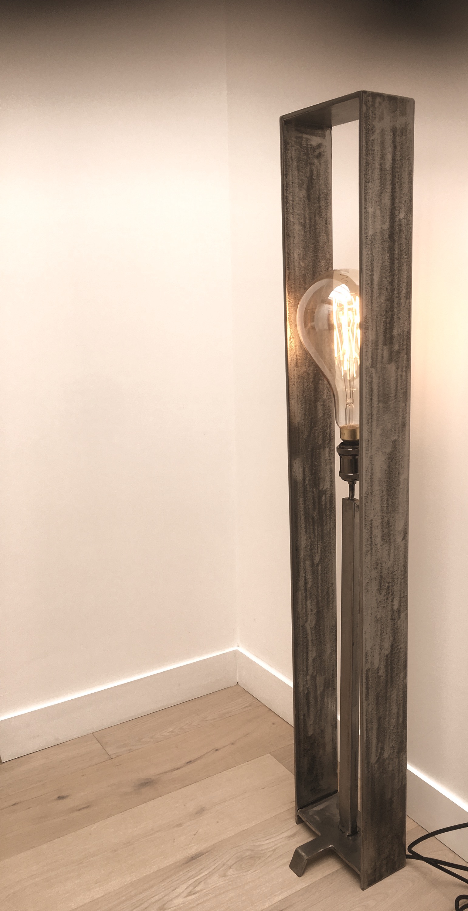 Ce modèle rectangulaire de lampe sur pied à disposer au sol, s’inspire sans ambiguïté du brutalisme. Réalisée en acier poli et d’une dimension importante de 130x20x10, elle marque par son style design et puissant. Très contemporaine, elle constitue une pièce de décoration à elle seule.